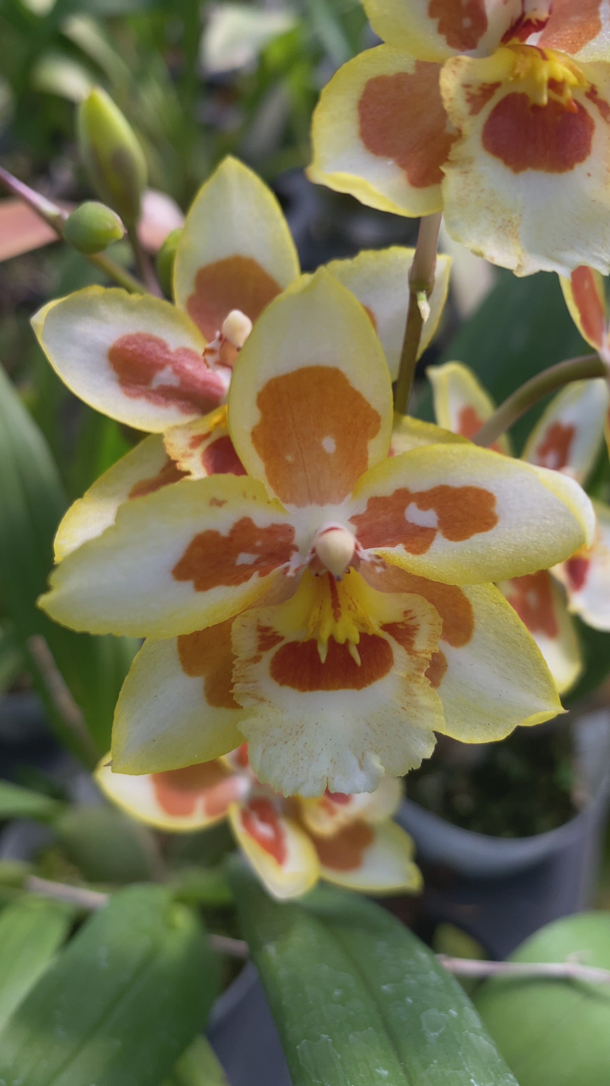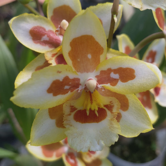 花瓣為明亮的黃色、帶有紅橙色斑點、唇瓣為金黃色、中央有明顯的紅橙色圖案 / 赤オレンジの斑点のある明るい黄色の花びら、そして明確な赤オレンジのパターンが特徴の金黄色のリップ。