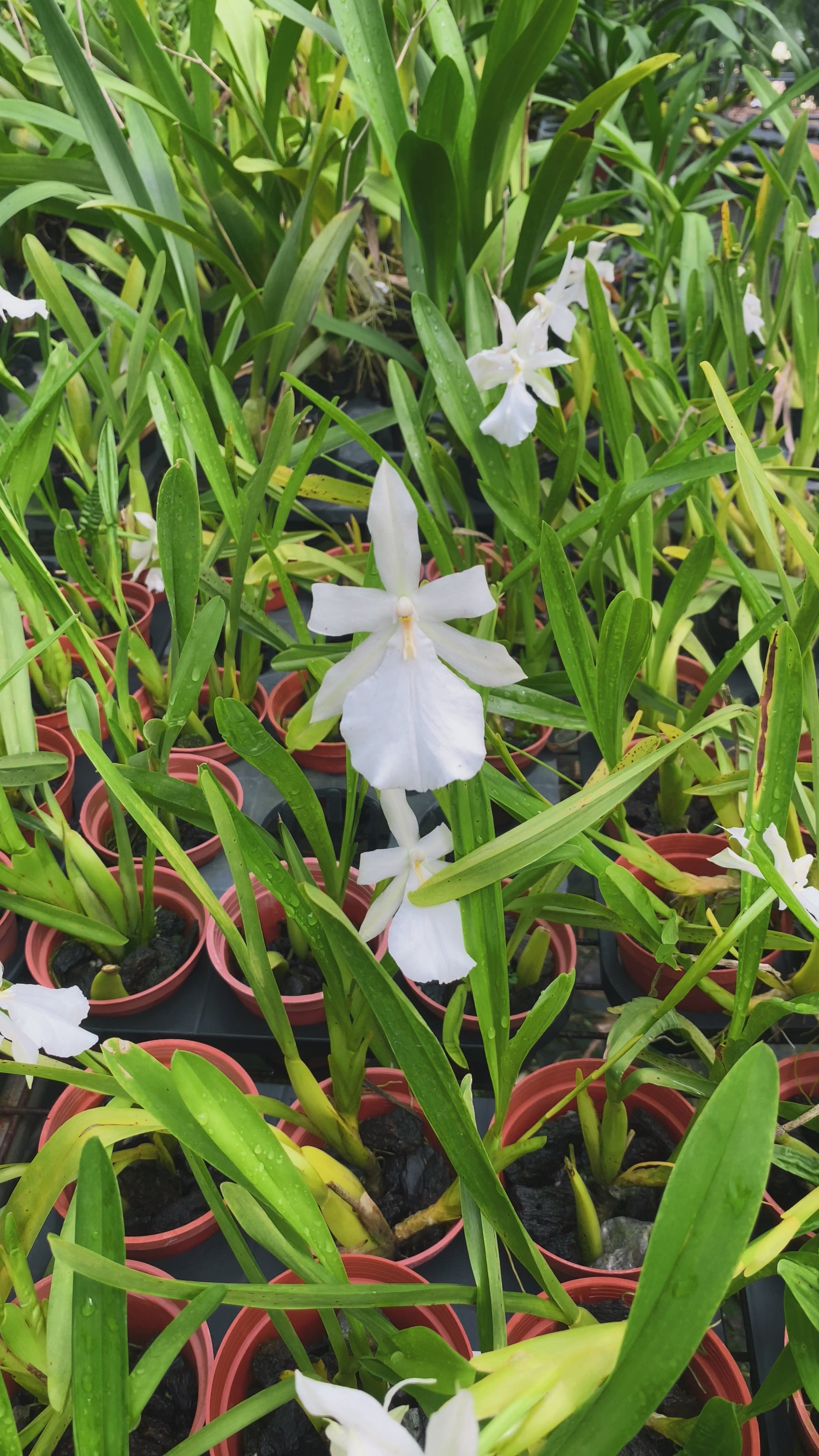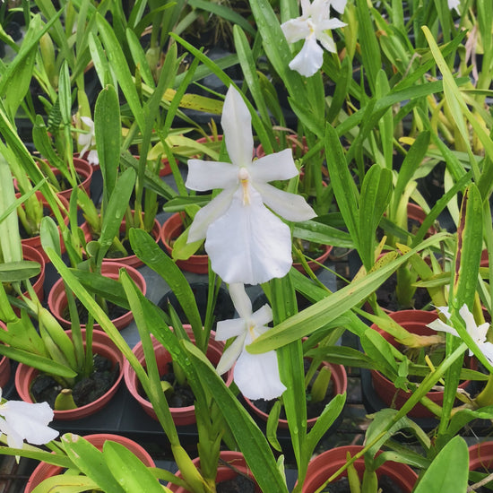 花瓣為白色、萼片為淡綠色、唇瓣純白無斑點 / 白い花びらに淡い緑色の萼片があり、リップは斑点がなく純白です。